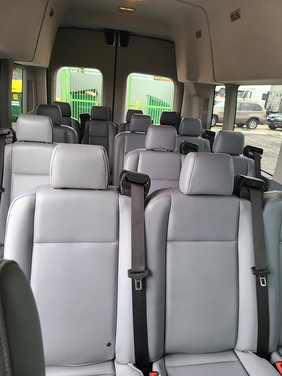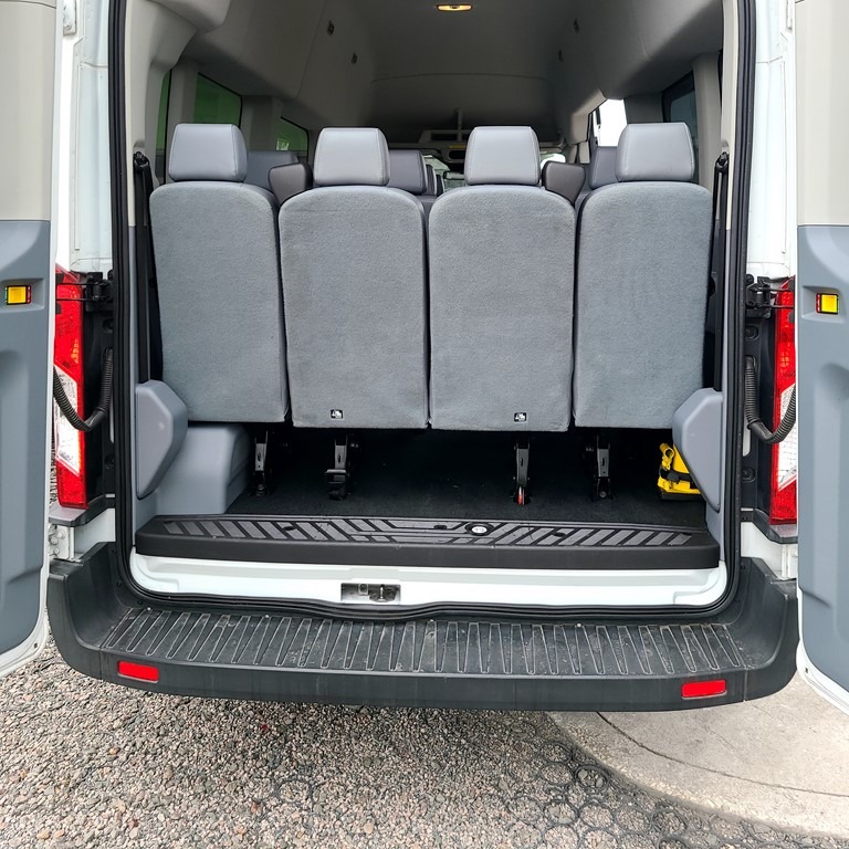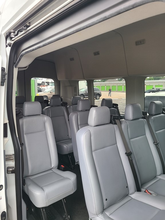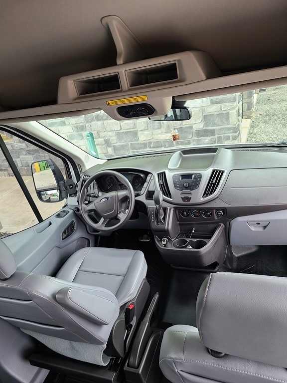 This 2018 Ford Transit 350 15-passenger van has White Exterior. Enjoy excellent steering and handling and an incredibly quiet, smooth ride in the spacious Ford Transit 15-passenger van rental from Luxedvans.